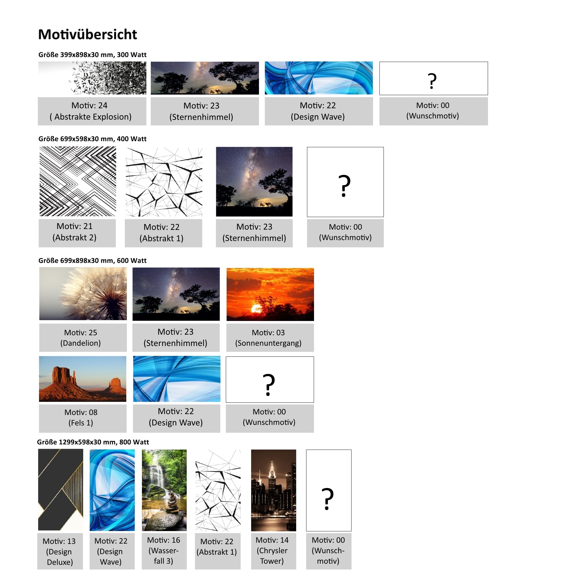 Die pflegeleichte Glasfront (Sicherheitsglas) der Infrarotheizung Deluxe kann entweder mit einem unserer auswählbaren Standardmotiven, oder auch mit einem persönlichen Motiv bedruckt werden. Dabei kann es sich um ein Motiv aus diversen Bilderdatenbanken wie z.B. Stockphoto oder Fotolia, oder auch um ein privates Foto handeln. Schicken Sie uns zur Prüfung der Machbarkeit einfach Ihr gewünschtes Motiv per Mail an office@agadon.com.